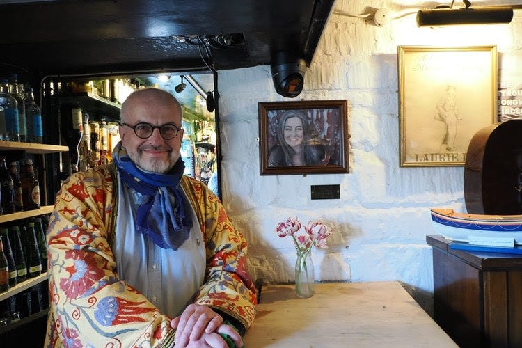 Polly’s husband Ian with her newly unveiled picture on the wall of the Woolpack Pub, Slad.